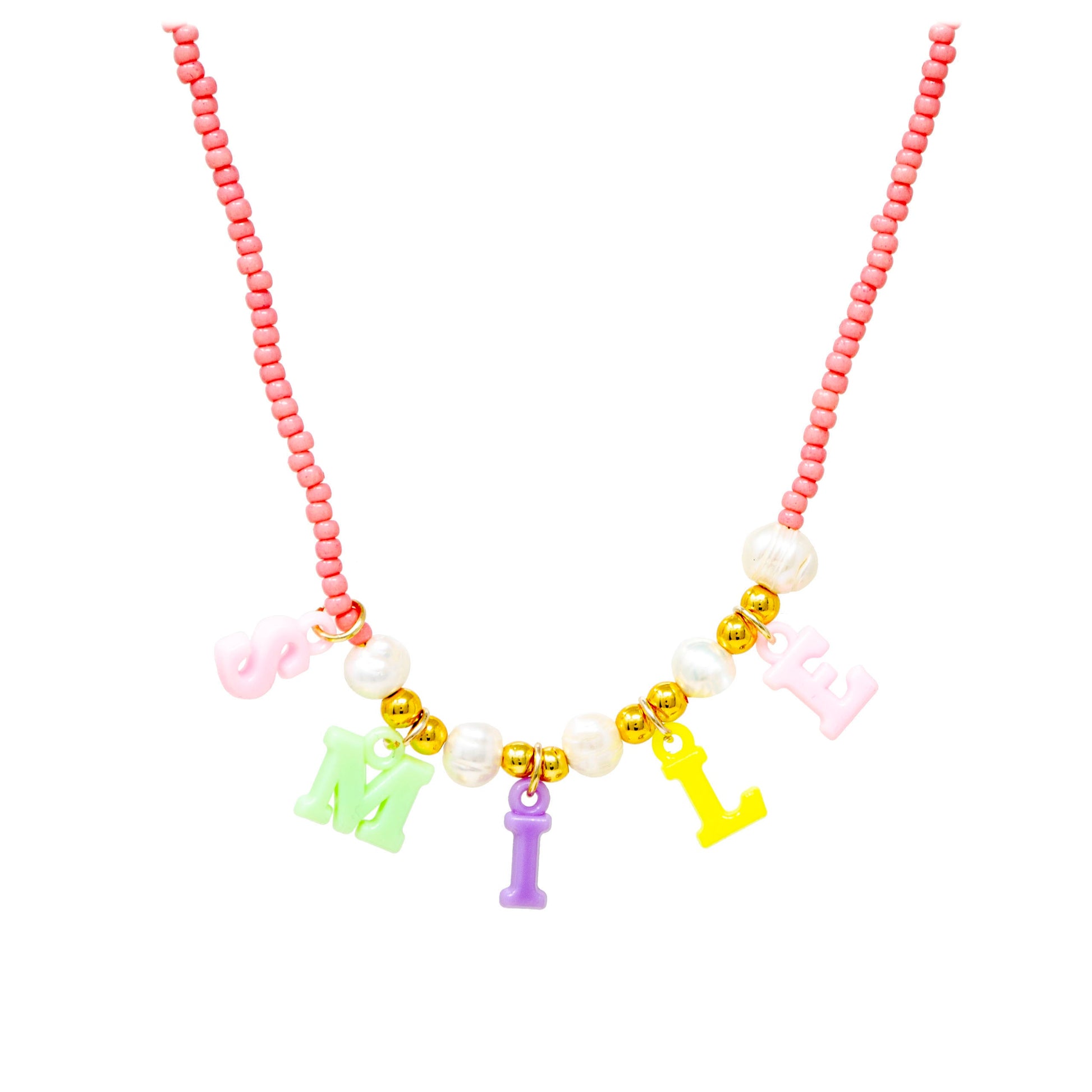 Keep the good vibes going with this adorable “SMILE” necklace! Designed with colorful pastel letter charms, shiny gold beads, and pearl accents on a strand of playful pink seed beads, this cheerful piece adds instant positivity to any outfit.