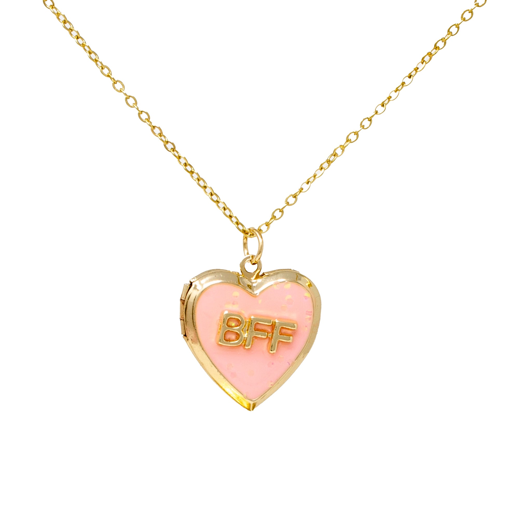 Celebrate friendship with these adorable matching BFF lockets! Each necklace features a heart-shaped locket in shimmering enamel (one purple, one pink), finished with gold “BFF” lettering on the front. The lockets open up to hold a tiny photo or note inside—perfect for keeping your bestie close at heart.