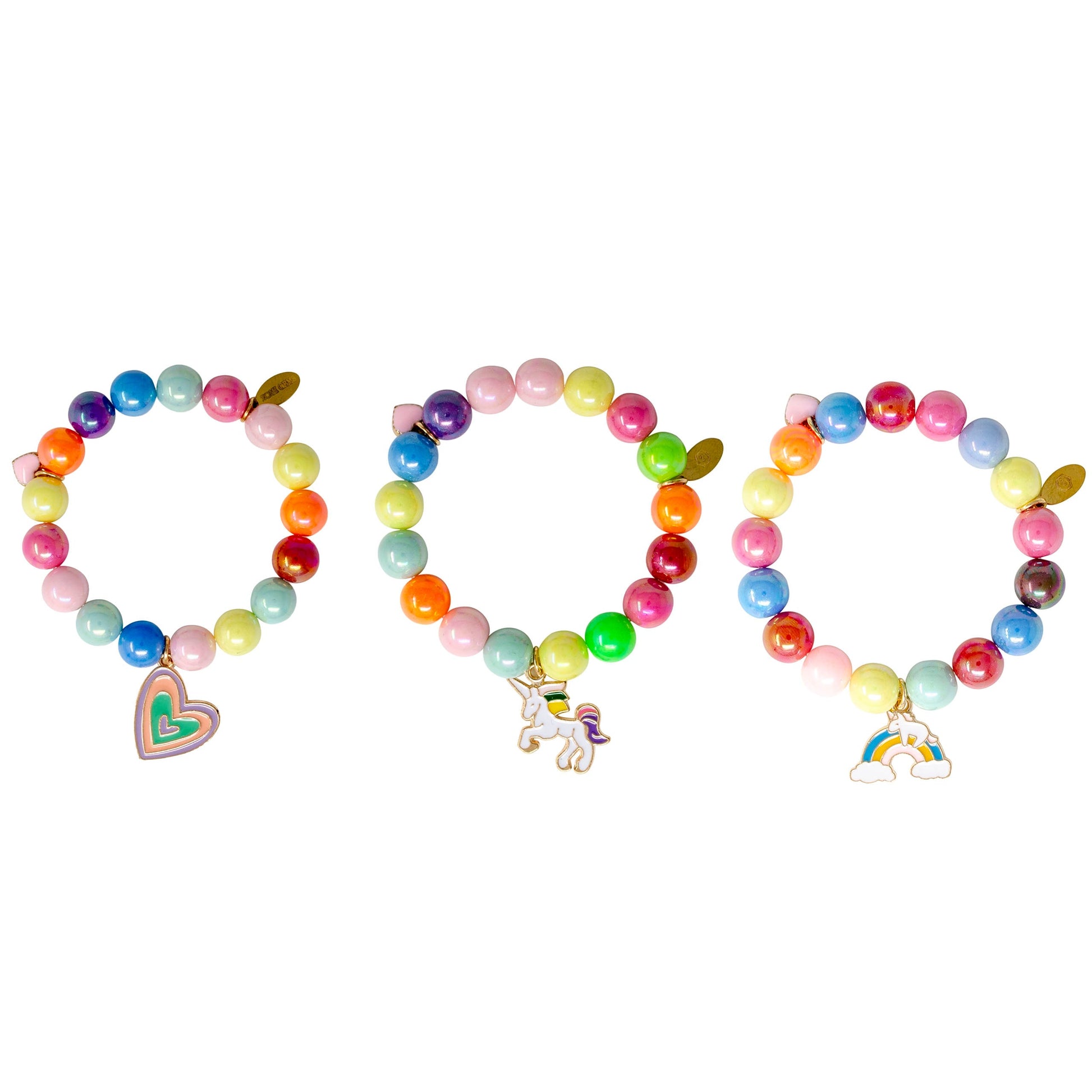 A bright and bubbly addition to any outfit! This Bright Gumball Rainbow Bracelet Set adds a playful touch with three colorful bracelets featuring gumball-sized beads and sweet rainbow and unicorn charms. It's nothing short of gumdrop-fabulous!