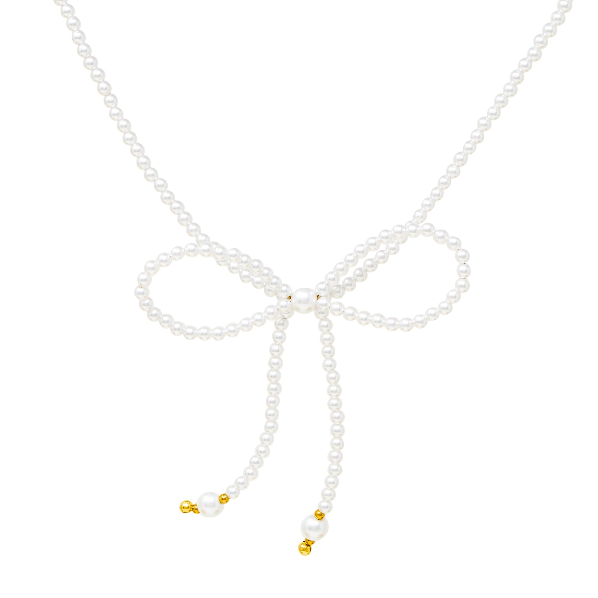 Delicate, feminine, and timeless—this pearl bow necklace adds a touch of elegance to any look. Designed with lustrous faux pearls arranged in a graceful bow silhouette, it’s finished with dainty dangling strands accented by gold details for a modern twist.